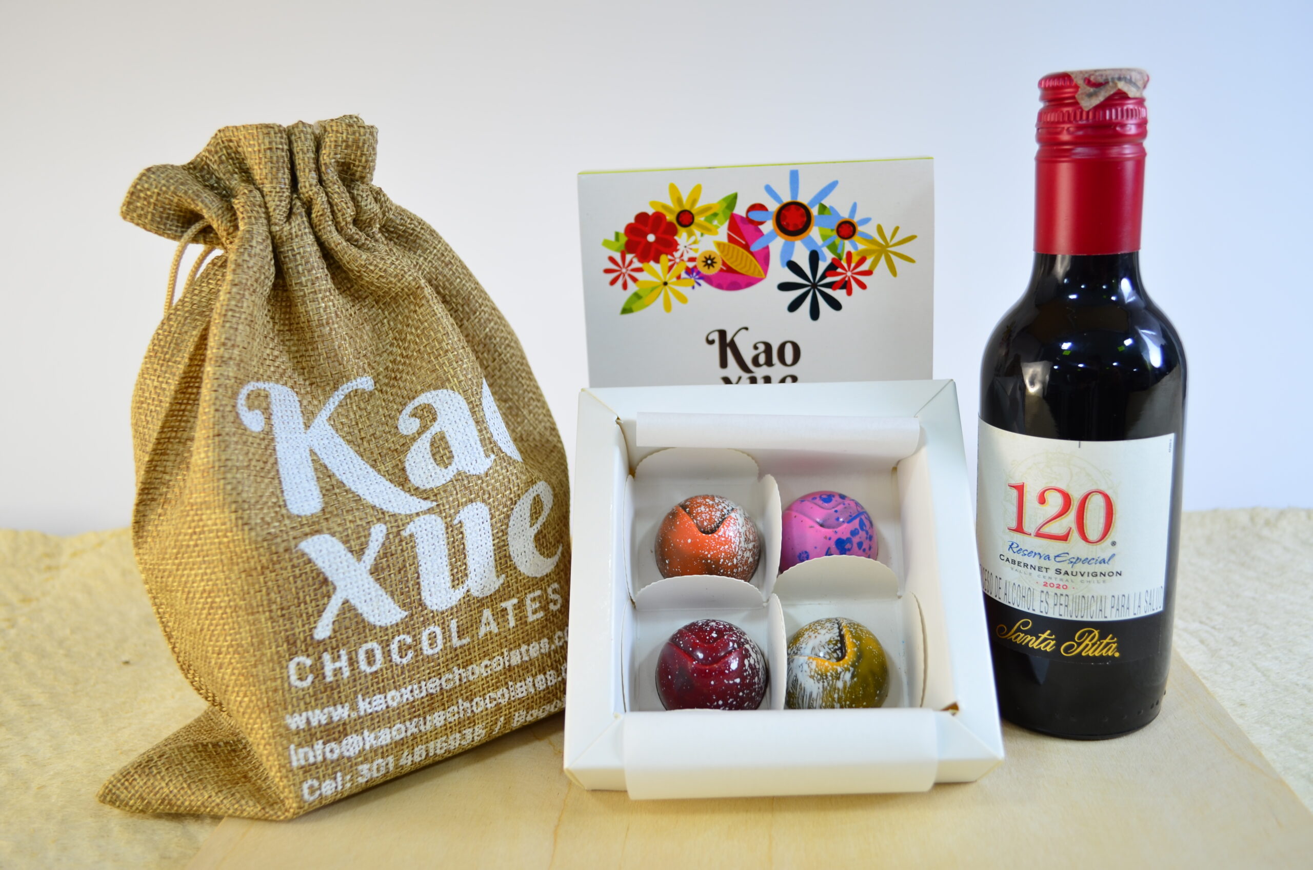 Caja de cartón x 4 bombones rellenos + 1 vino + 1 bolsa de yute +  Tarjeta personalizada.