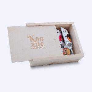 Caja de cartón x 4 bombones rellenos + 1 vino + 1 bolsa de yute + Tarjeta personalizada.
